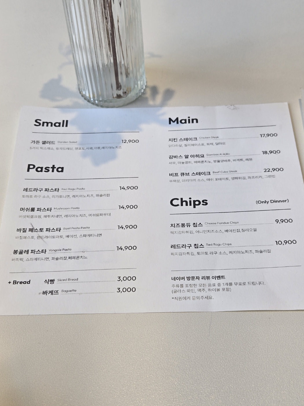 개인적으로 '레드라구 파스타'와 '비프 큐브 스테이크' 추천한다.