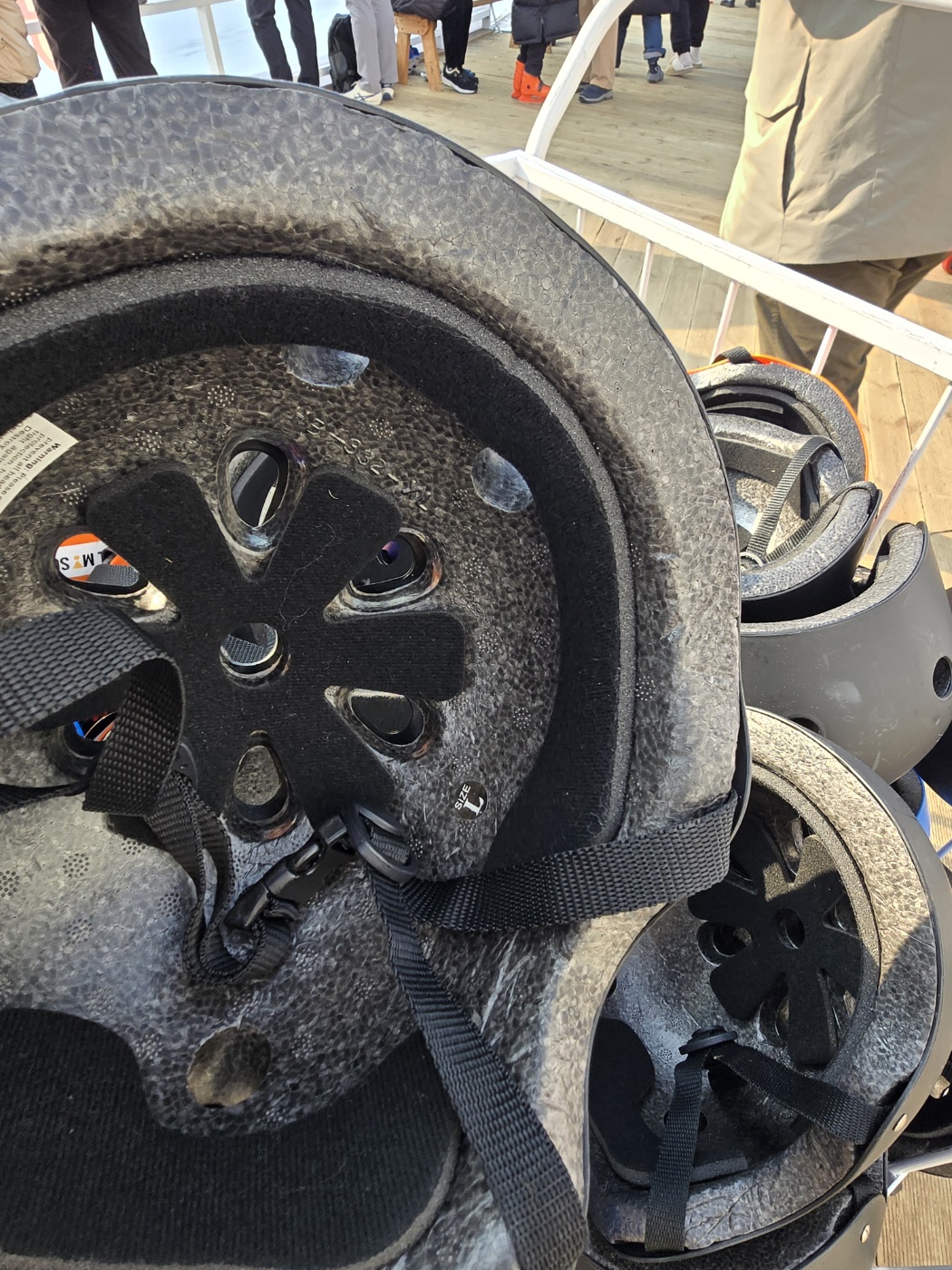 ● 헬멧 스몰사이즈 잘 찾기 : 헬멧 사이즈가 다 섞여서 있다. 헬멧 안에 스티커로 S/M/L 사이즈 표시가 되어있어서 잘 찾아서 스몰 사이즈를 선택해야한다. 스몰도 두상이 작은 아이는 좀 클 수 있다. 털모자를 쓰고 그 위에 씌어줘도 괜찮을 것 같다.